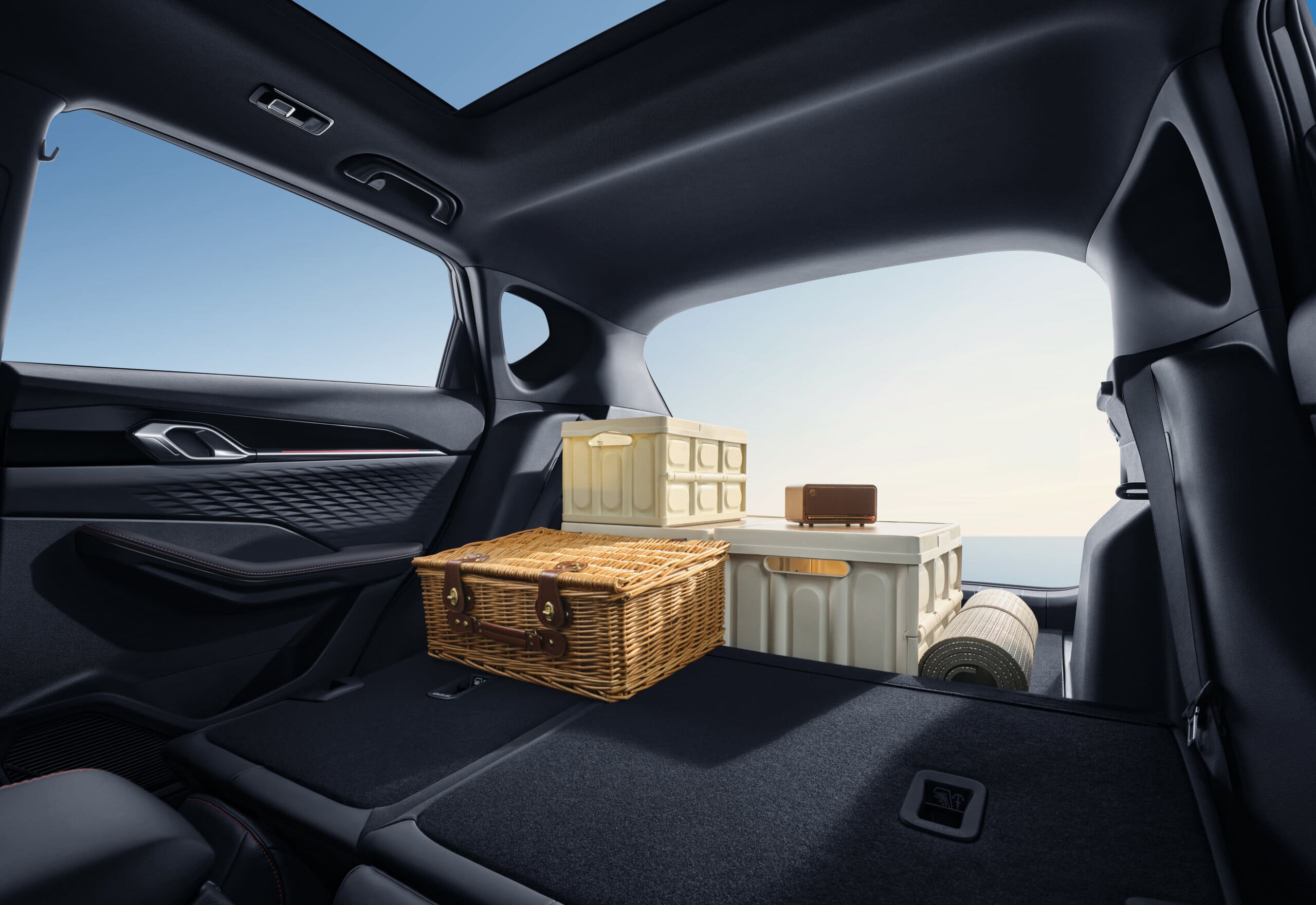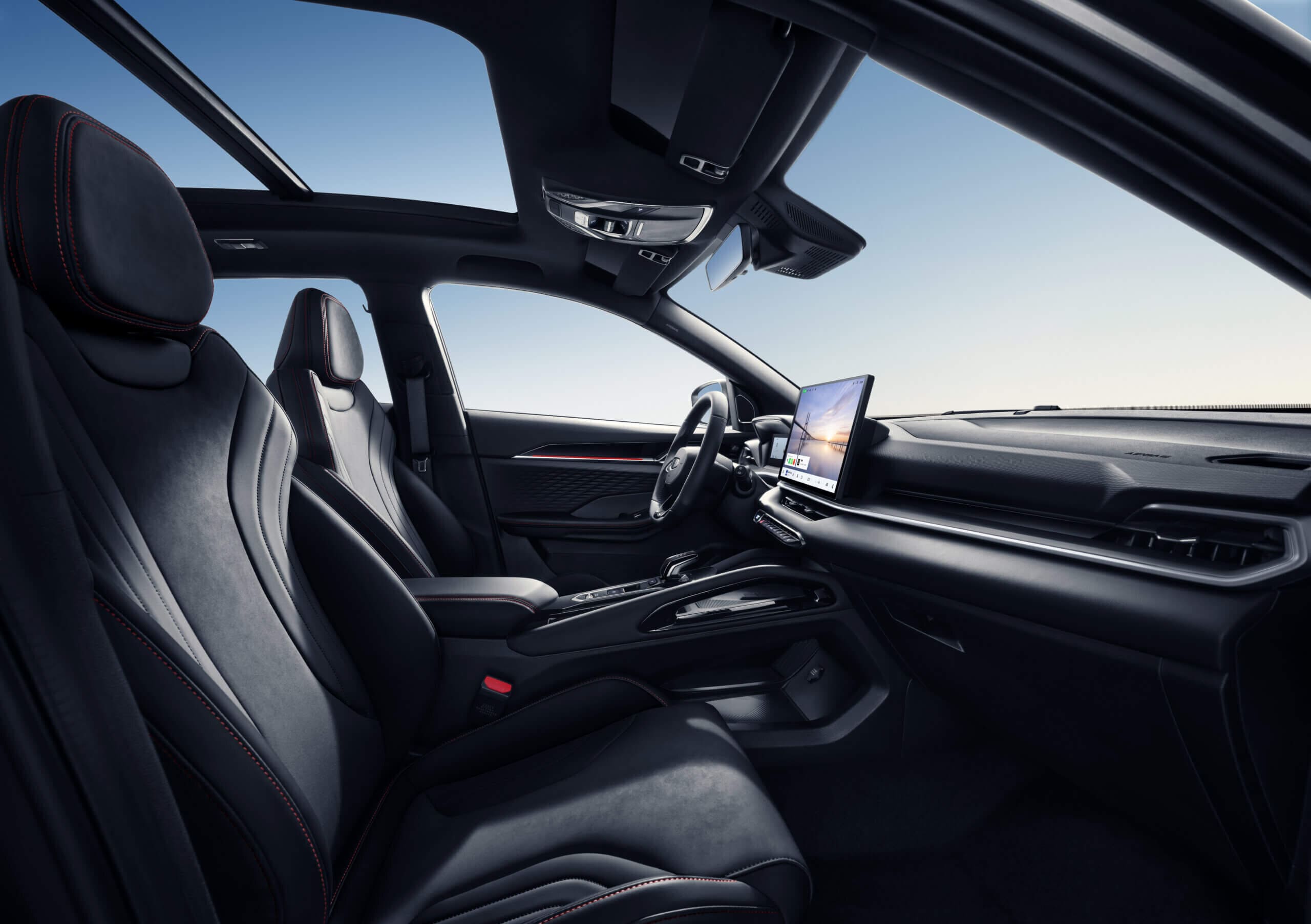 Interior con techo panorámico, pantalla táctil de 14,6”, asientos deportivos de cuero con ajuste eléctrico, maletero expandible hasta 1.150 L y cargador inalámbrico, pensado para una experiencia cómoda y conectada.