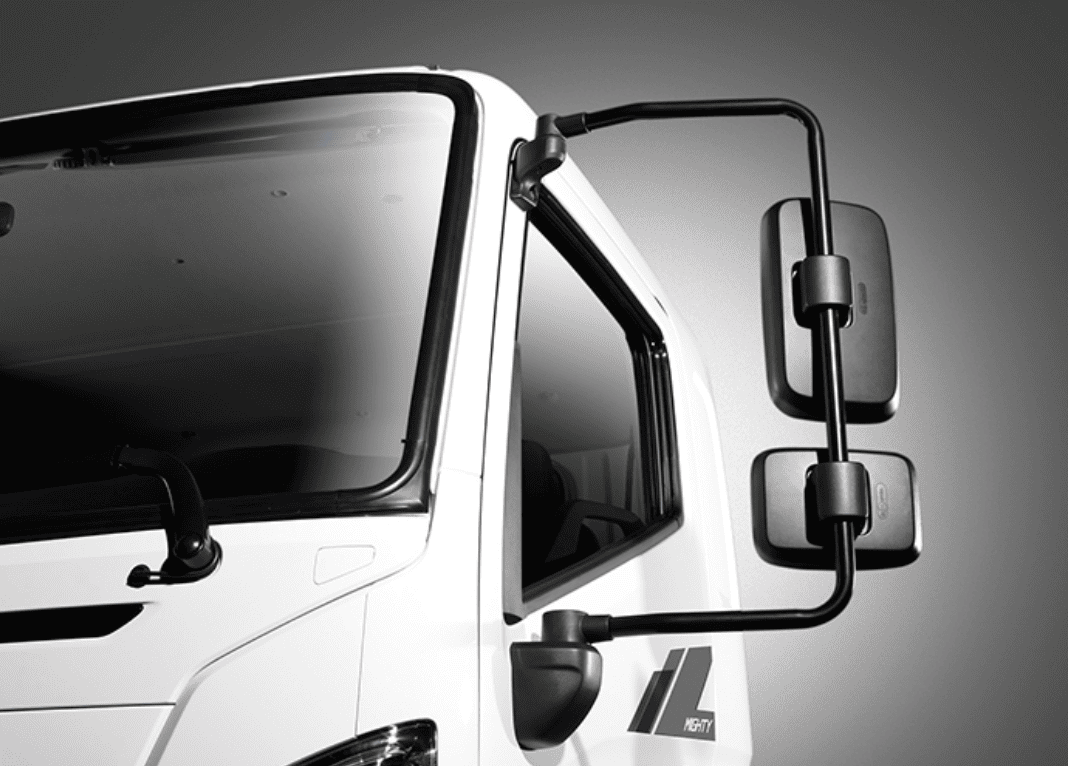 Exterior robusto y funcional con diseño moderno: parrilla frontal potente que realza presencia, vidrios laterales amplios para mejor visibilidad, faros estilizados con luces diurnas y antiniebla, manillas ergonómicas y escalones de acceso amplios que facilitan entrada/salida, todo pensado para trabajo eficiente y seguro.